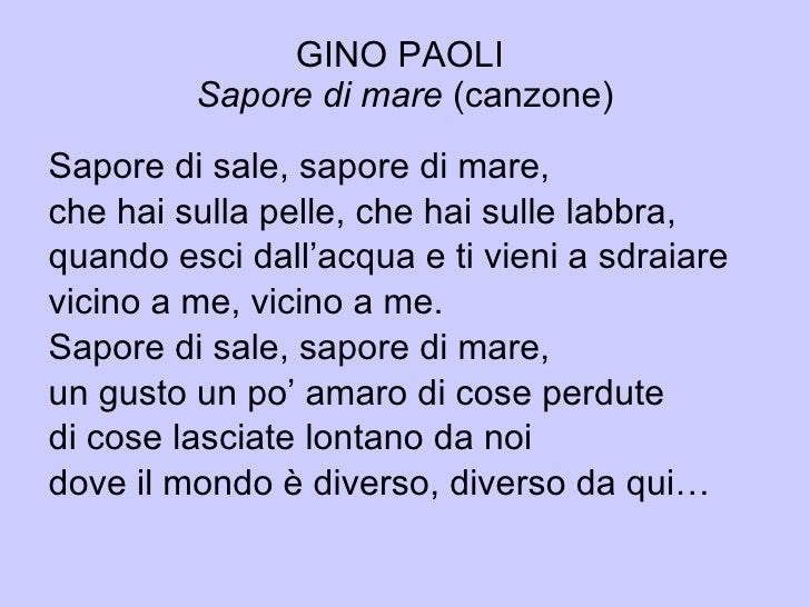 Sapore di sale testo canzone cantato da gino paoli: Do lam sapore di sale, sapore di mare, rem7 sol7 un gusto un po' amaro di cose perdute, mim lam di cose lasciate lontano da noi. Sapore di mare, un gusto un po' amaro di cose perdute, di cose lasciate lontano da noi dove il mondo è diverso, diverso da qui. Il brano è stato scritto dal a seguire, trovate il testo della canzone. Sapore di sale è un famosissimo brano composto e pubblicato nel 1963 dal celebre cantautore gino paoli.